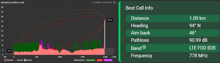 Accurate prediction of mobile signal strength (RSRP) for each operator at a precise remote location.